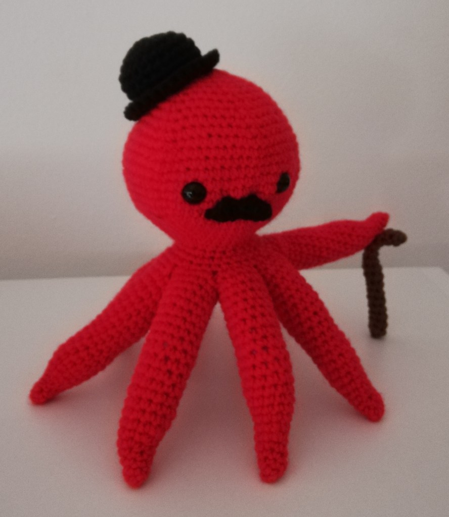 Toujours dans les petites peluches ludiques, j’ai fait ce poulpe, qui est au final bien plus gros que prévu. Les tentacules abritent du fil de fer pour leur donner une forme, ça marche moins bien que prévu mais il tient à peu près debout grâce à sa petite canne, c’est déjà pas mal !