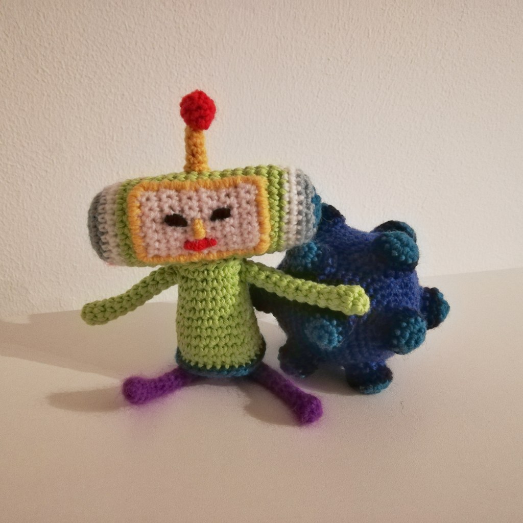 C’est la minute geek : lors du dernier concours chez JSUG, un des gagnants pouvait me commander la peluche de son choix, et c’est comme ça que j’ai fait ce prince (qui vient de la licence des Katamari, ce jeu merveilleux !). J’ai bien galéré sur la broderie jaune qui entoure le visage, mais j’aime bien le résultat. Et pour faire comme dans le jeu, j’ai glissé des aimants dans la boule bleue, comme ça on peut la rouler dans son tiroir et attraper tous les trombones !