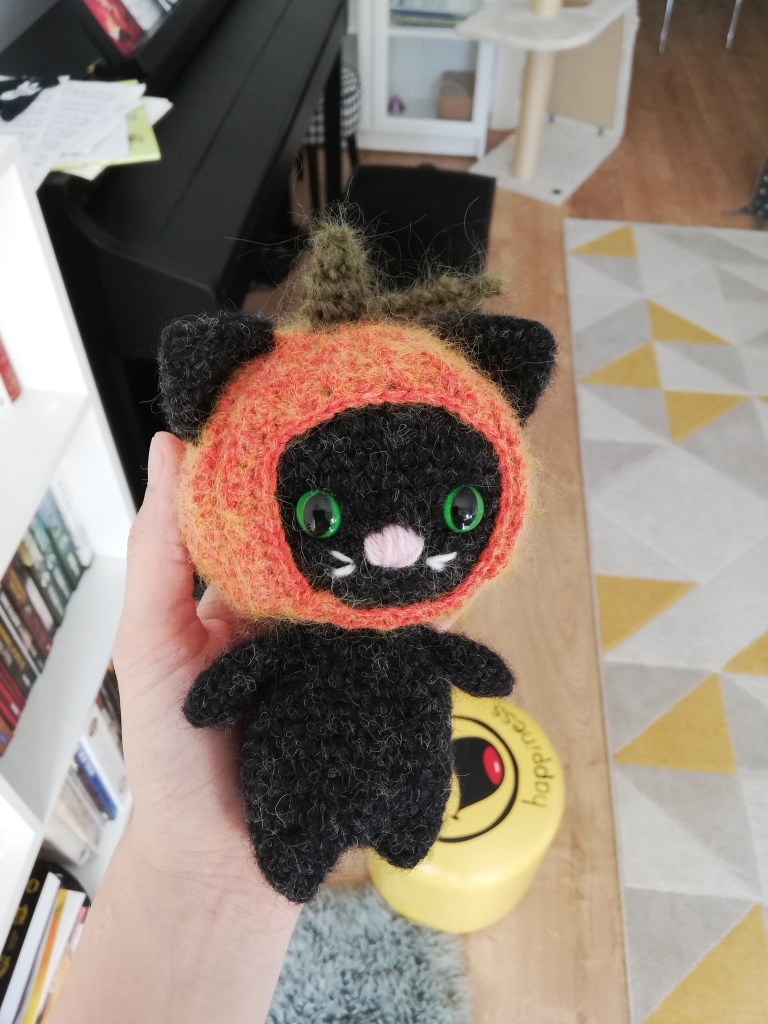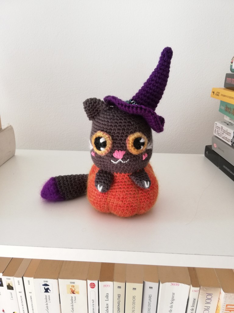 Après tous ces cadeaux et commandes, j’ai eu envie de faire quelques peluches pour moi. Alors évidemment, j’ai profité de l’automne pour faire des citrouilles ! J’étais un peu déçue du rendu des deux chats (le premier modèle était assez mal écrit, et le deuxième chat a l’air totalement stupide, mais là je pense avoir surtout mal choisi ma laine), par contre la dernière citrouille est exactement comme je le voulais, donc je suis ravie !