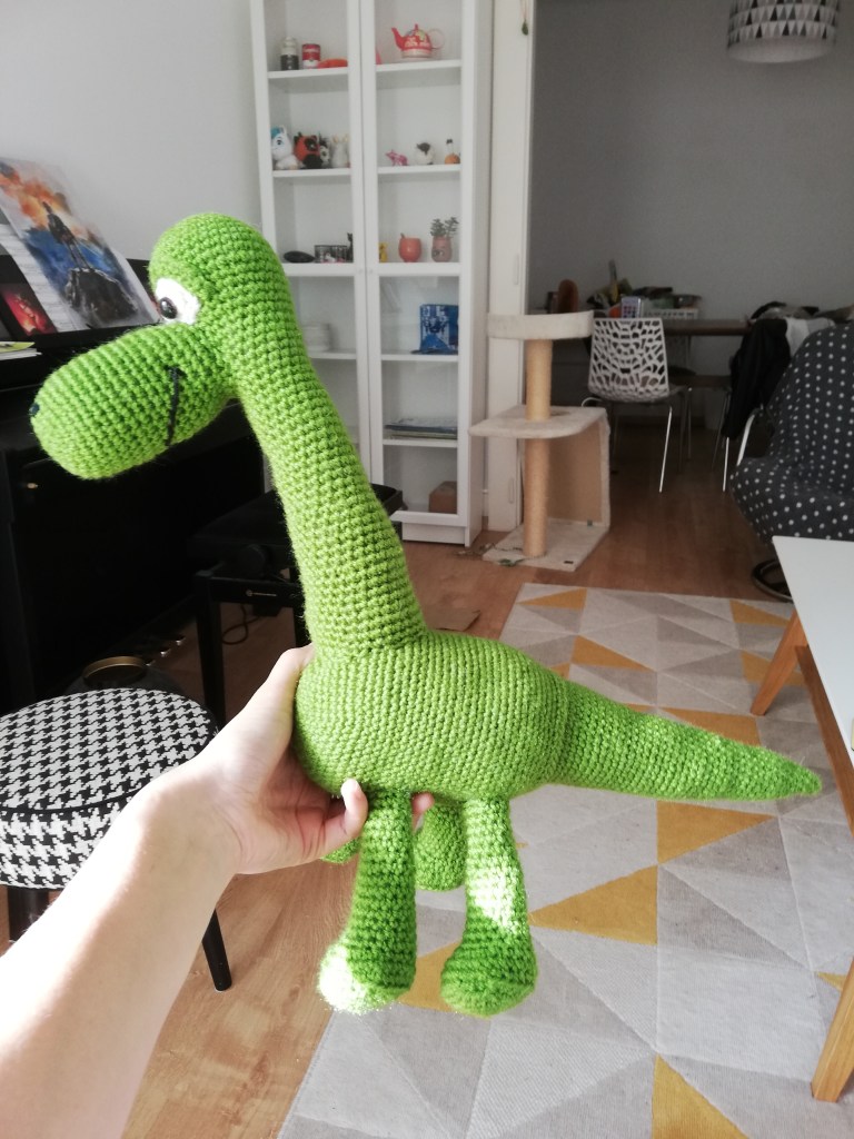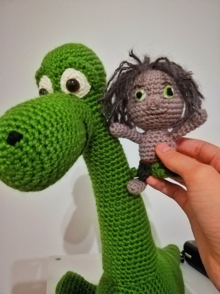 Ma première commande ! C’est le pingouin vert qui m’a demandé de faire Arlo (du film Le Bon Dinosaure) pour sa petite puce, et ça m’a fait trop plaisir, merci encore à elle pour la confiance ! Arlo est devenu immense, et j’en ai profité pour faire également Spot (première fois que j’utilisais du feutre pour les yeux, et que j’essayais de faire des cheveux). Le colis est en route !