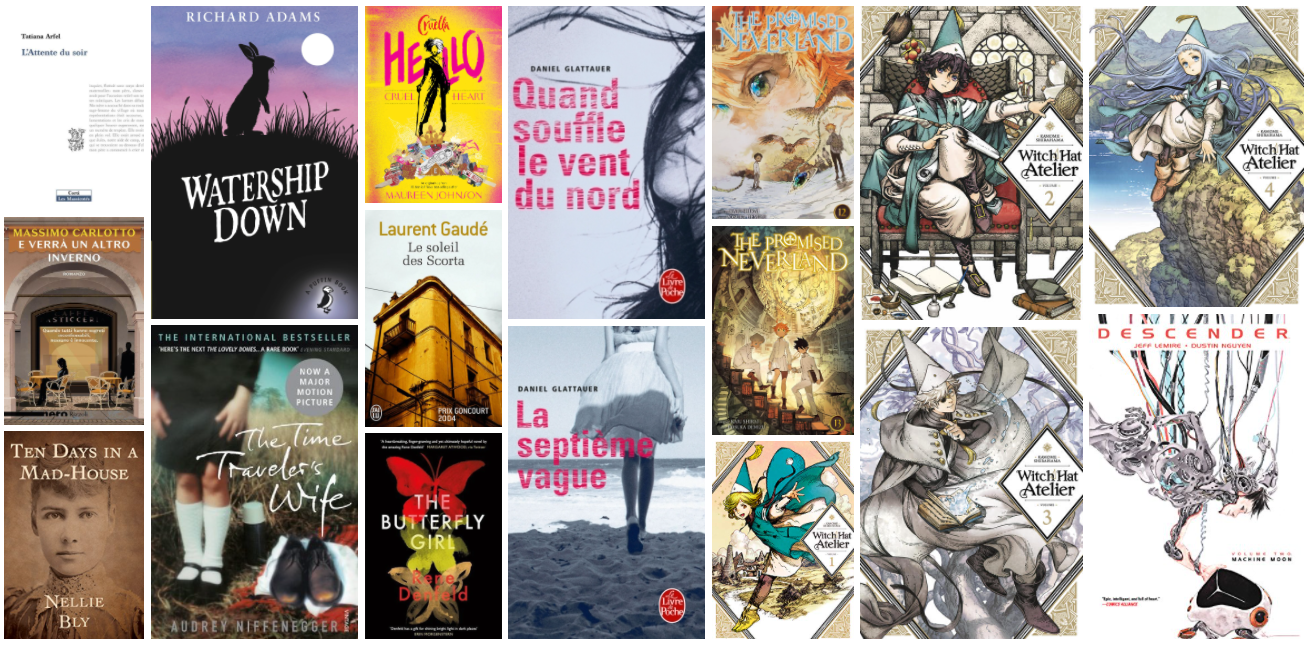 Richard ADAMS – Watership downTatiana ARFEL – L’attente du soirNellie BLY – Ten days in a mad-houseMassimo CARLOTTO – E verrà un altro invernoRene DENFELD – The butterfly girlLaurent GAUDE – Le soleil des ScortaMaureen JOHNSON – Hello, Cruel HeartAudrey NIFFENEGGER – The time traveler’s wifeKamome SHIRAHAMA – Witch Hat Atelier T1-T4Kaiu SHIRAI – The Promised Neverland T12-T13Daniel GLATTAUER – Quand souffle le vent du Nord T1-T2Jeff LEMIRE & Dustin NGUYEN – Descender T2-T3- David James DUNCAN – La rivière pourquoi
