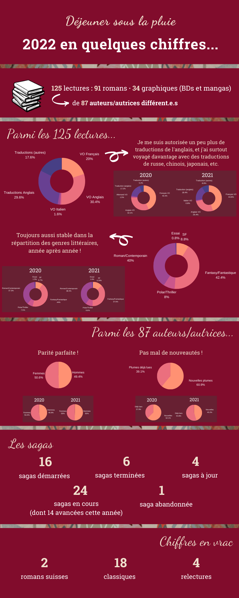 Même si je n’ai pas fait de gros challenge annuel comme c’était le cas pour les classiques ou les lectures imposées auparavant, je constate que mes tendances sont plutôt stables. Je me tourne spontanément vers la VO, je varie les genres littéraires, je lis quand même des classiques, tout ça me conforte dans l’idée que pour 2023, je vais y aller tranquillement et ne pas me mettre trop de contraintes. Le seul point un peu plus embêtant, à l’heure actuelle, c’est le nombre démesuré de sagas que je lis en parallèle, dont certaines sont d’ailleurs en pause depuis plusieurs années. Mais pour le reste, je suis très contente de mes lectures !